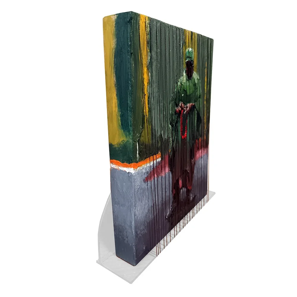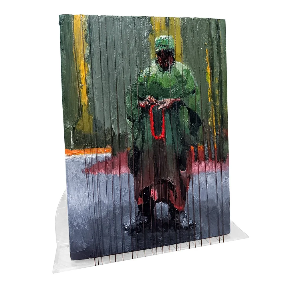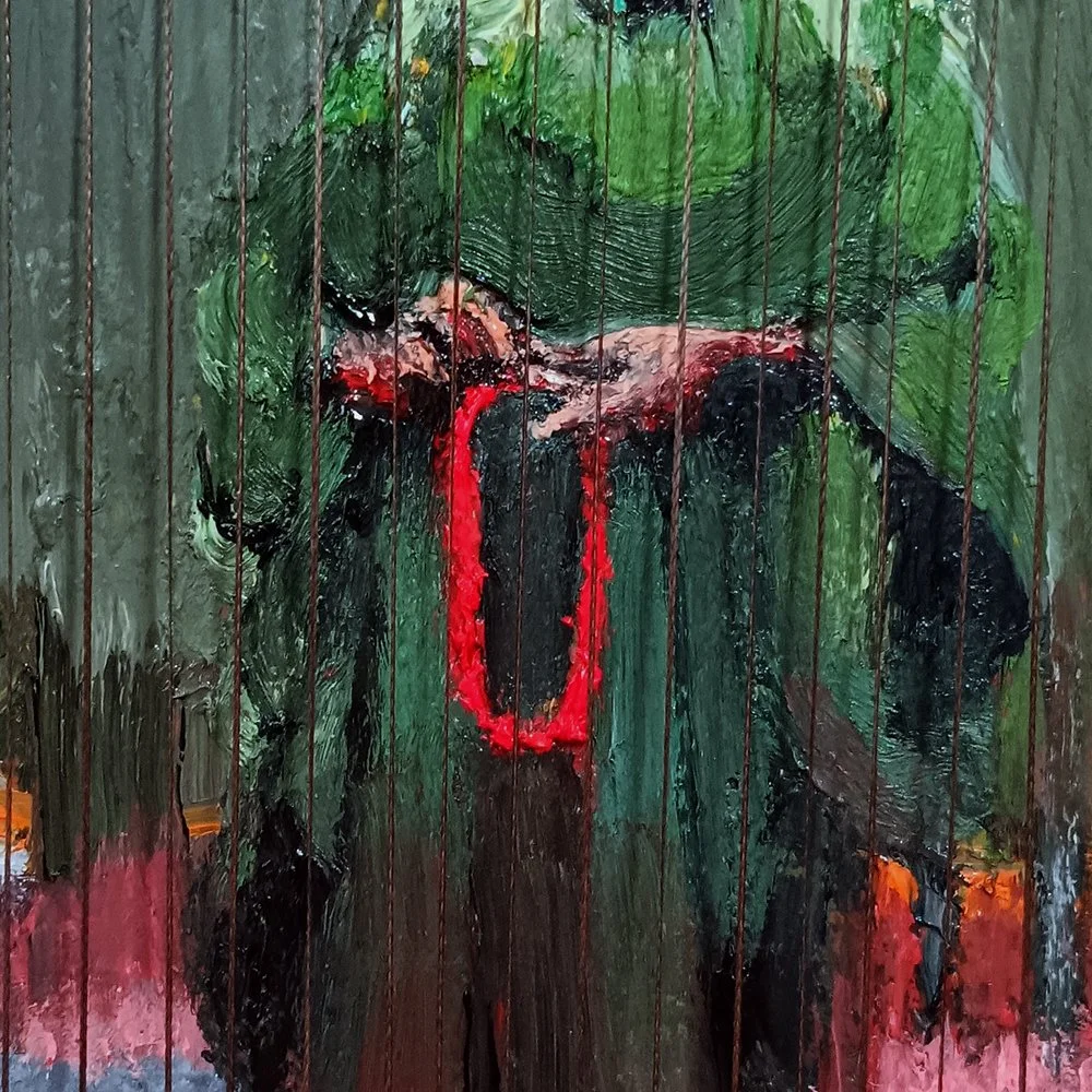 Nez Perce Forest 27 (paracord)5” x 7”Oil on wooden panel with fishing line on shelf.2025