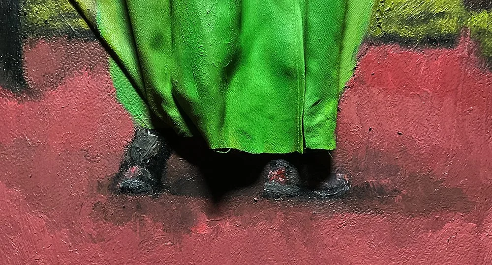 Oil and portion of the top of a skirt on the frame sheet of a backpack.